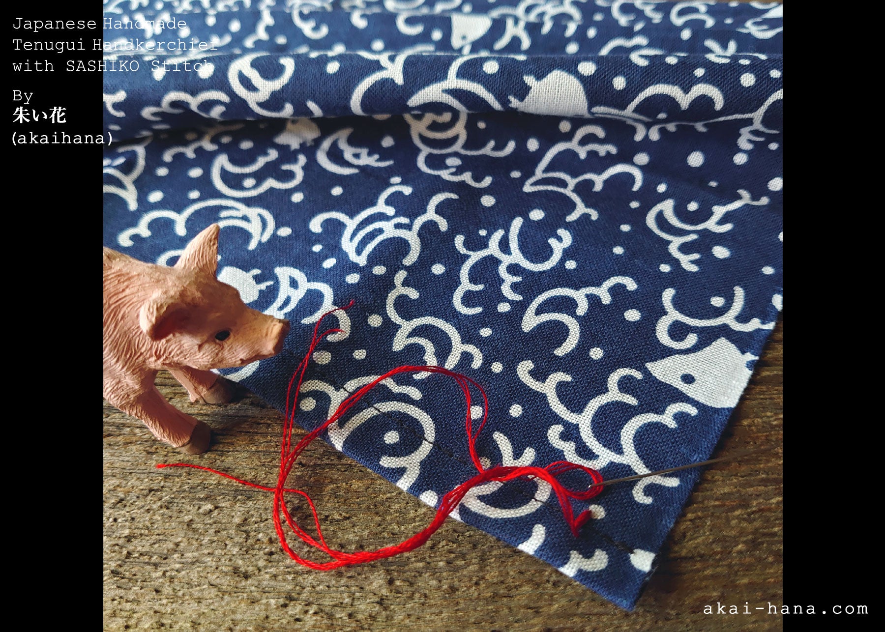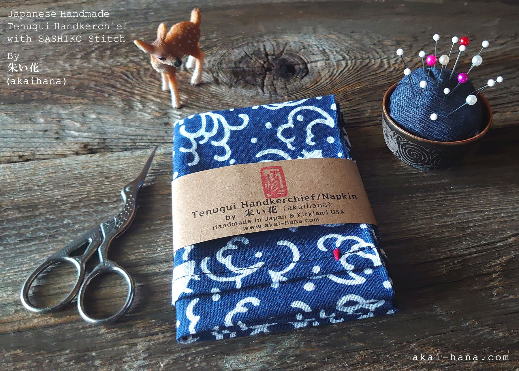 Hand sewn Handkerchief made with Japanese Tenugui. It is printed in special way, so that you can see the patterns in back side of fabric instead of white blank color. Both end of edges are finished. I added some little kick by one little sashiko hand stitch. Tenugui I use are all made in Japan, 100% cotton.