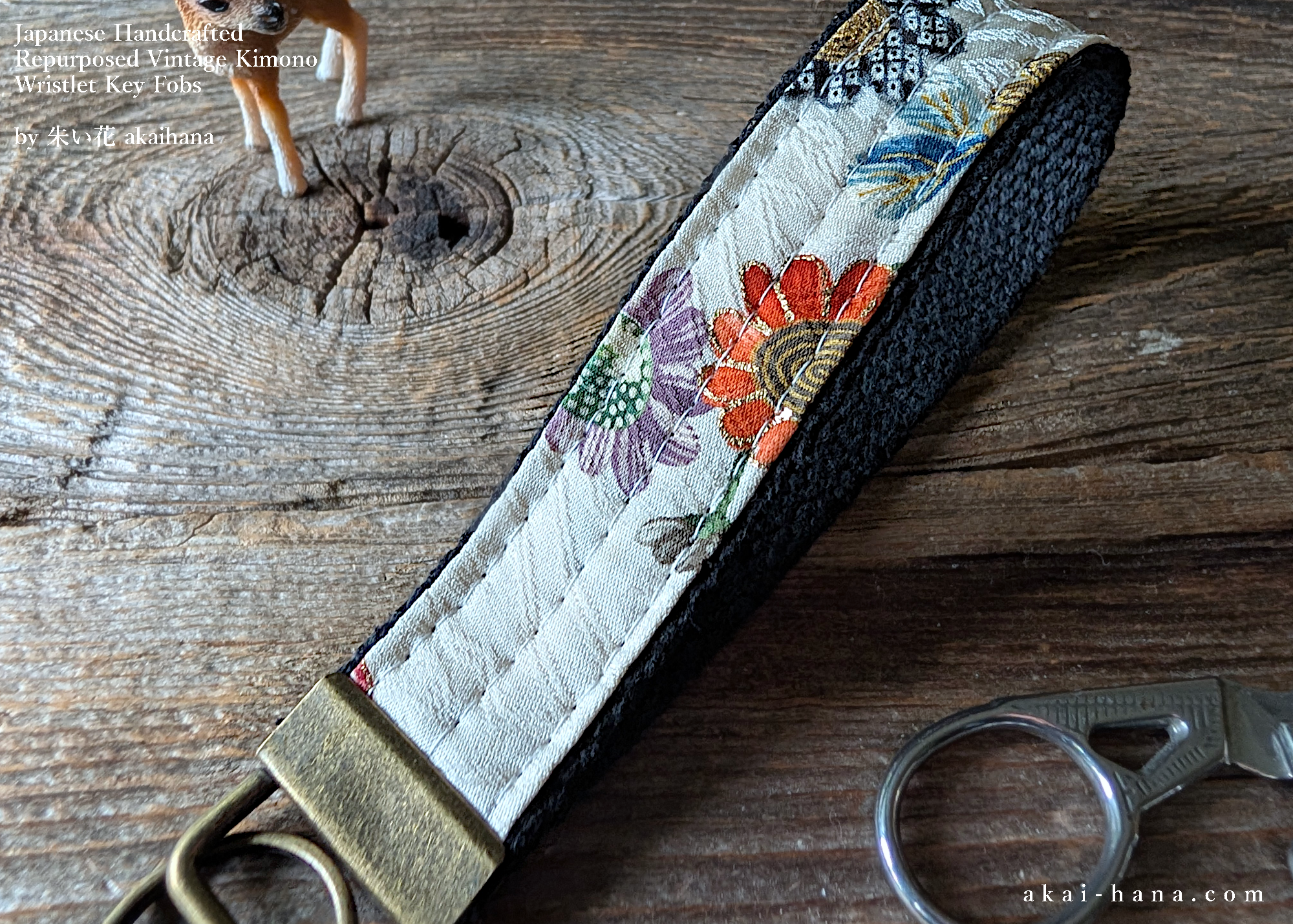This is the key chains/key fobs with vintage kimono. The material is white floral vintage kimono, the webbing is black 100% cotton and metal parts are antique gold. Each pieces has one and only unique look depending on how I cut the the fabric. If you would like to make sure the actual pieces, please feel free to reach me anytime. I would be happy to send you some photos of available pieces at that time.