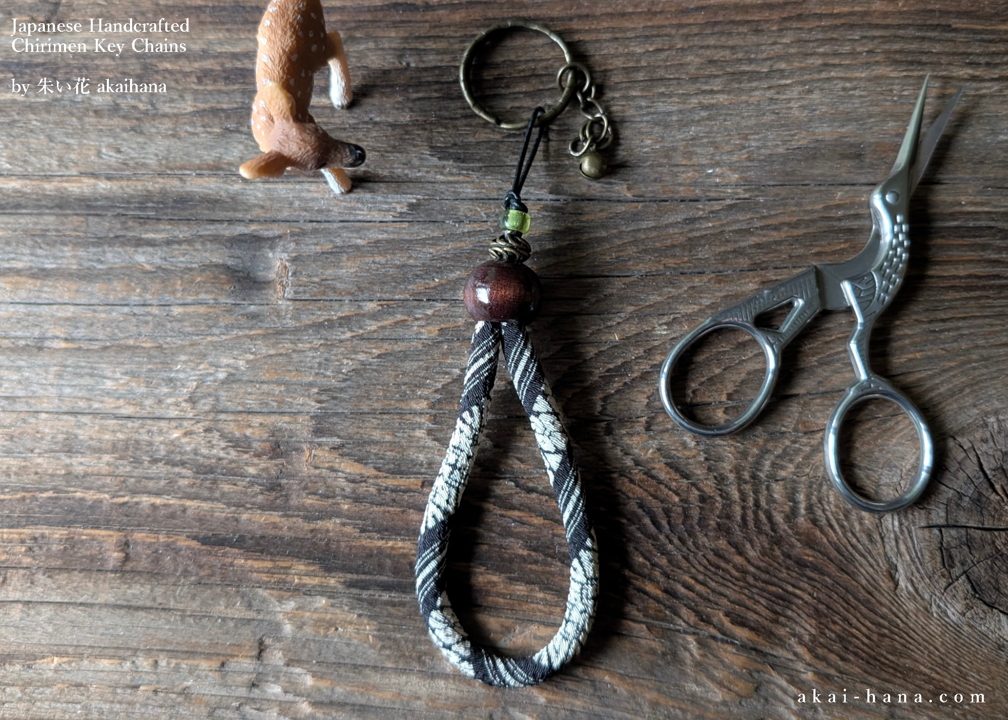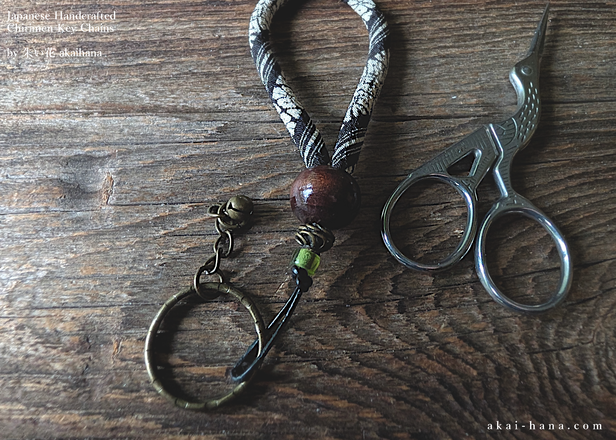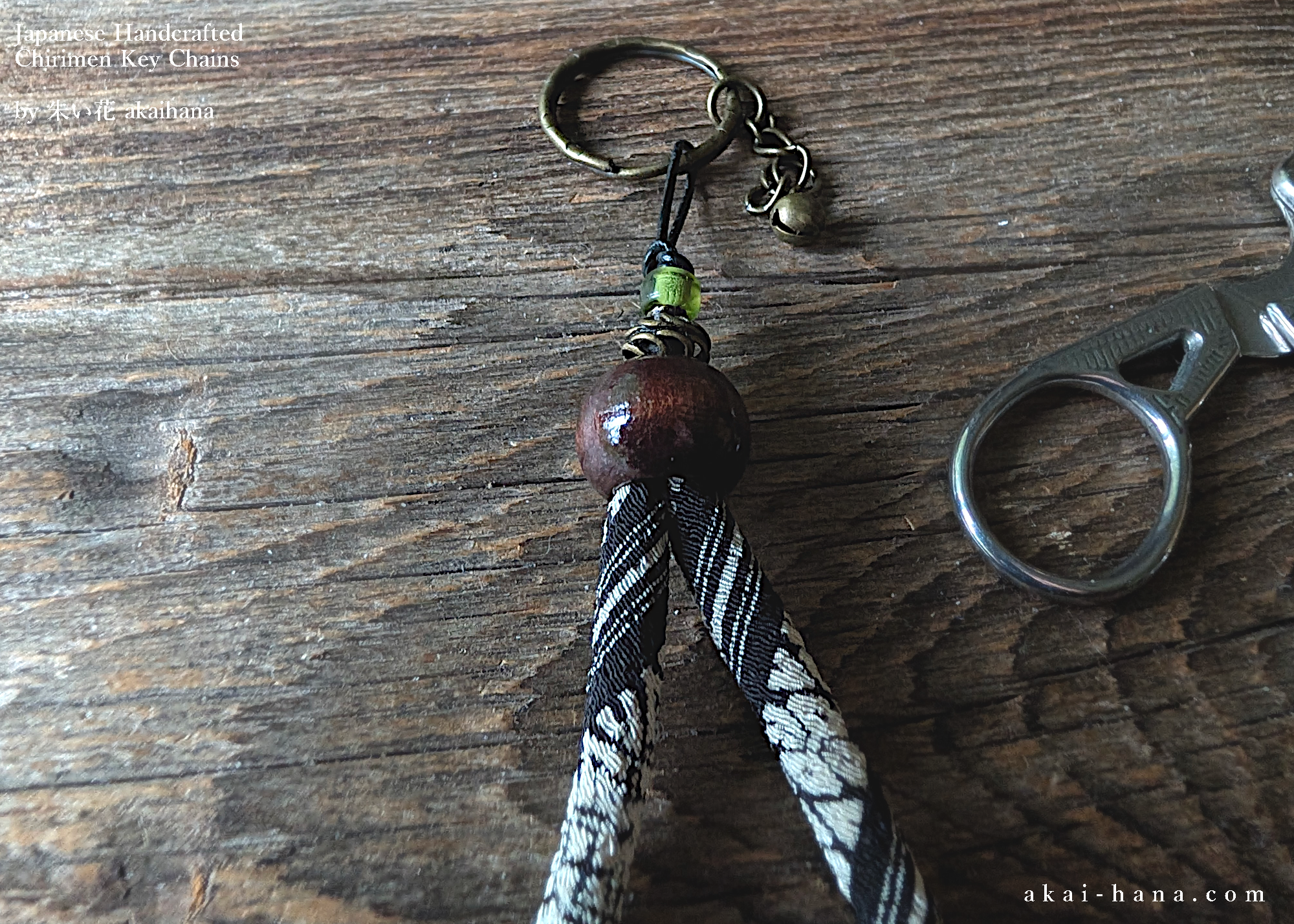 This is the key chains/key rings with Japanese Chirimen rope and some beads. I had fun playing around with different types of beads to add some extra flavor to it, and I picked the combination of metal and light green color Czech glass beads. Also I added a tiny bell. The key ring, chain and bell are antique gold. The pattern of Chirimen is Hakatajima (stripes) with black and white. Each piece is made by myself in Kirkland WA, USA.