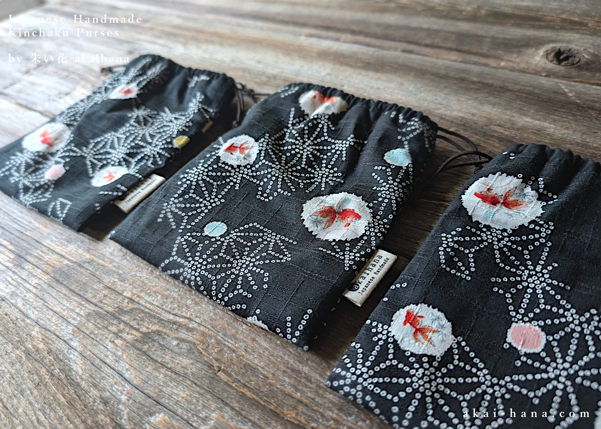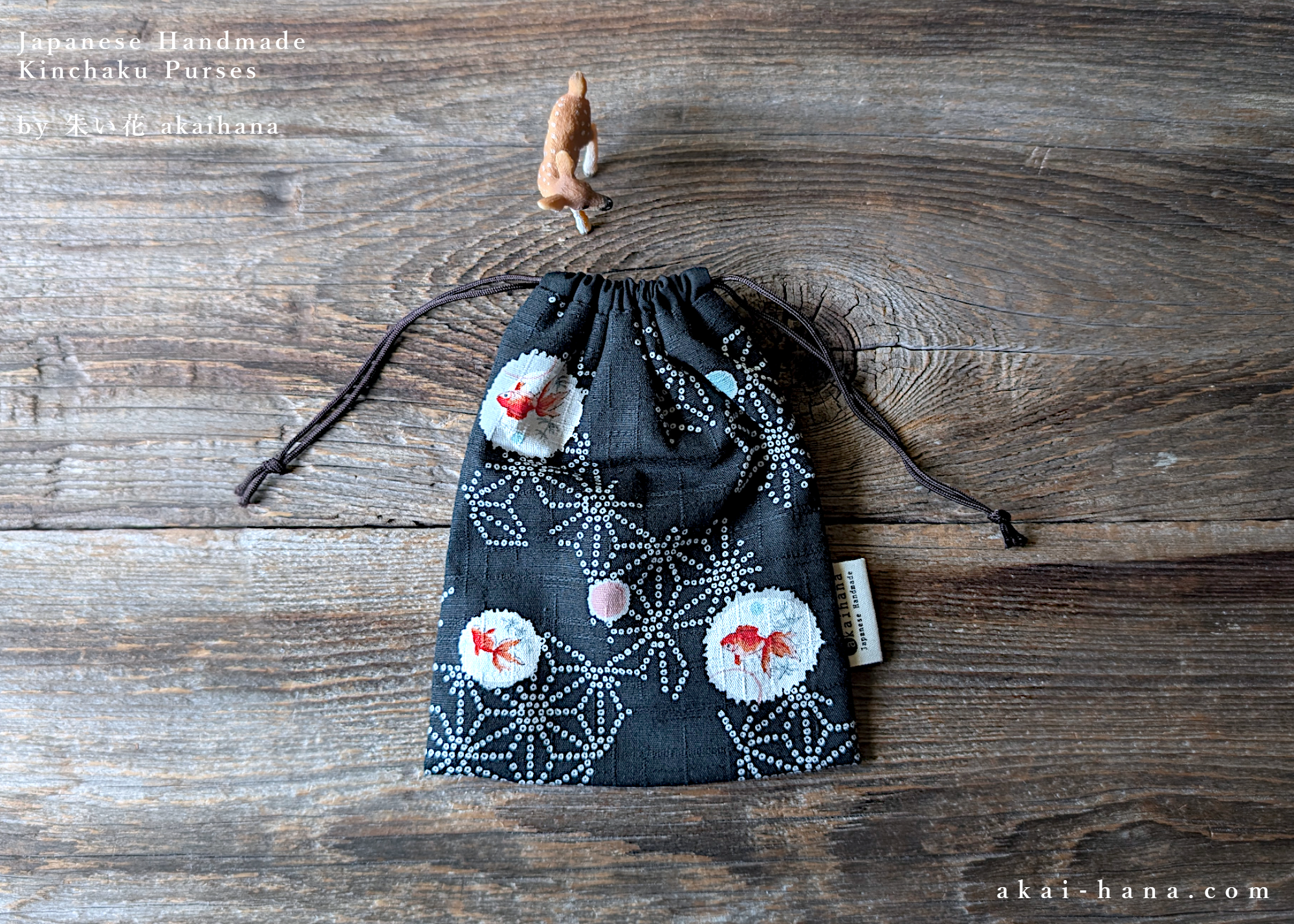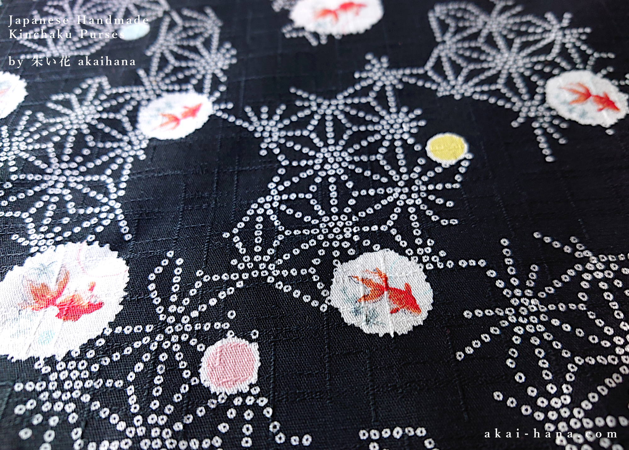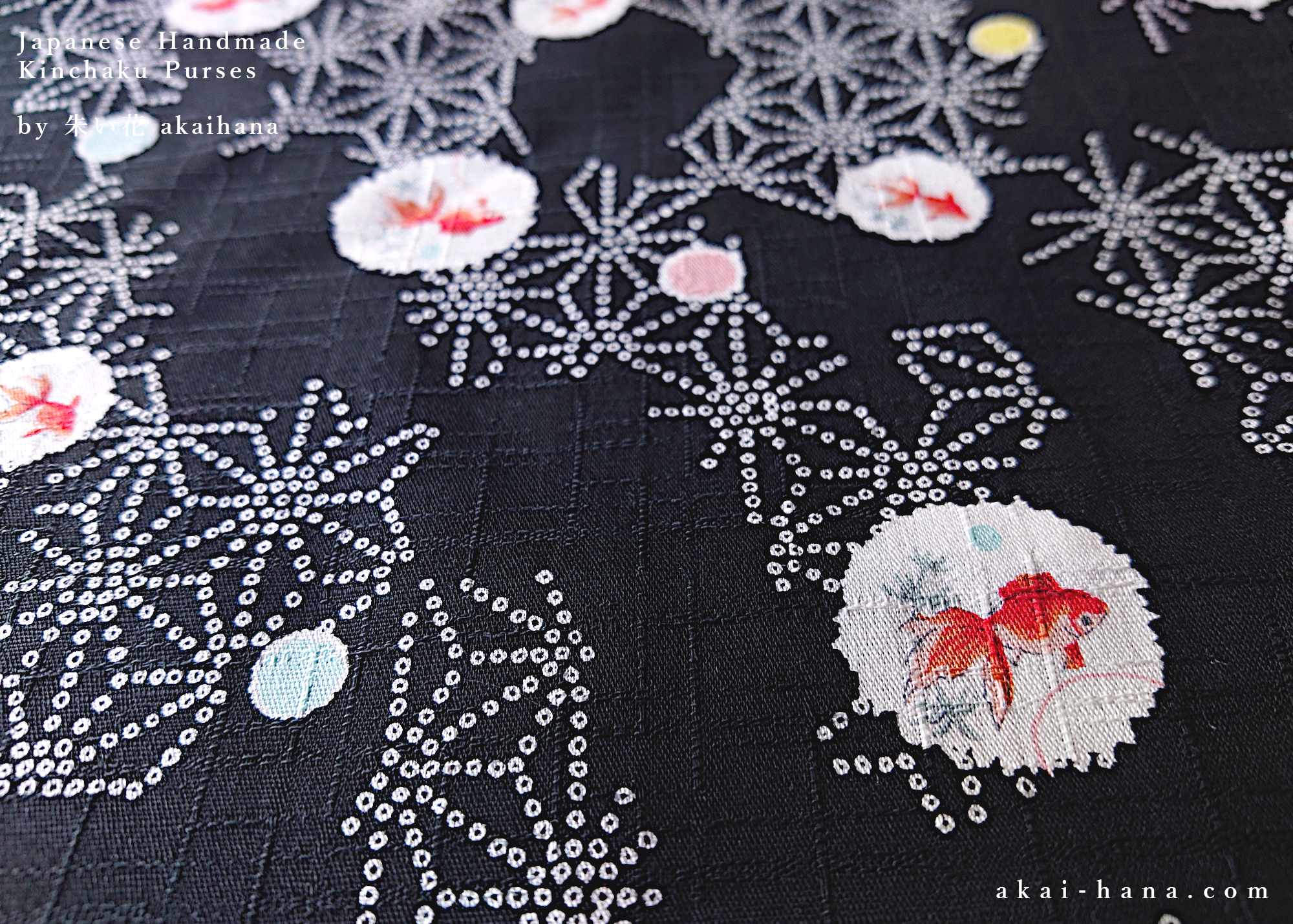 This is a drawstring purse, call kinchaku in Japanese, which is made with Japanese cotton fabric. The pattern is goldfish with some dots and asanoha (hemp leaf) patterns. Inside is lined with black solid cotton fabric. The cord is Edo uchihimo, made in Japan. It is great for carrying your coin purses, keys, lip sticks, sanitary/toiletry items.. whatever you can think of! It is also great for carrying your earphones and cords for your phones/tablets/PCs.