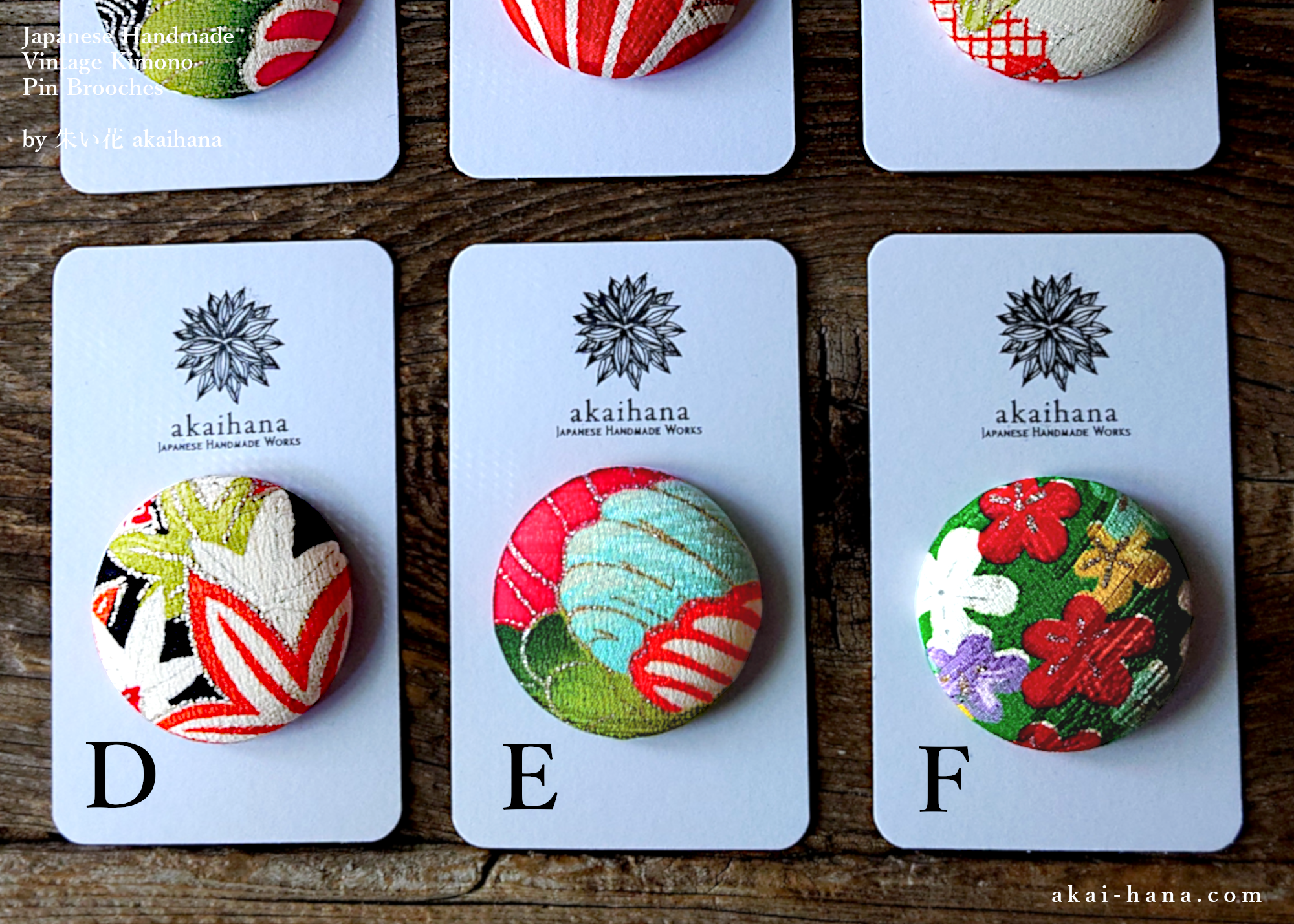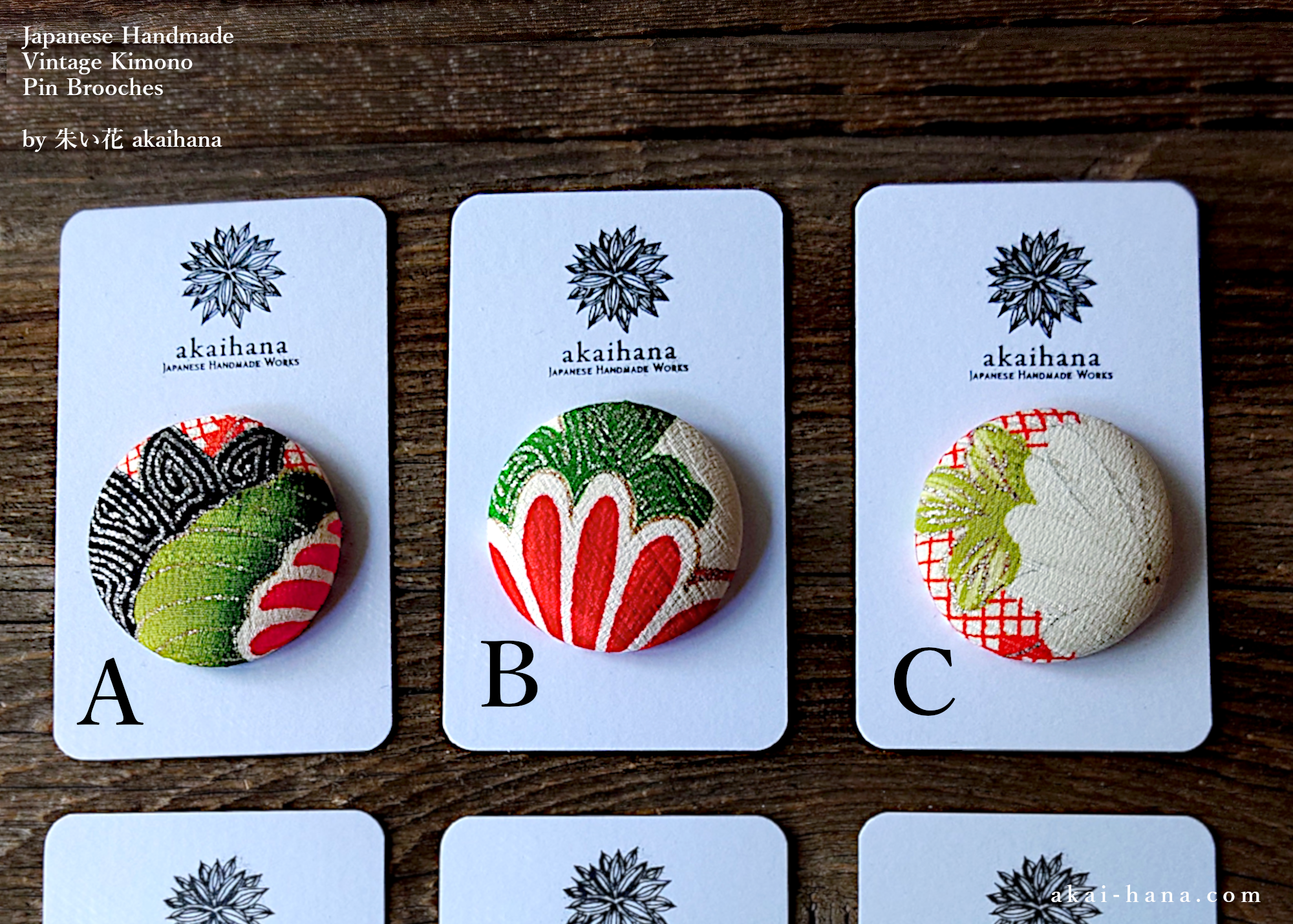 This is the pin brooches with Vintage Kimono covered button. Each buttons are made from old vintage/antique Kimono, only a few of each designs are available. The Kimono I used has a lot of spots and/or snags from aging over time, but there were still tiny but stunning sections that I could carefully cut and use them to make these buttons. Because of the nature of vintage materials, each pieces will have different looks depending on how I cut and place them into the buttons. Every buttons are handcrafted by myself in the no-pets/no-smoking home studio in Kirkland WA, USA. I treat the back side of buttons with fleece/felt (the color of fleece/felt might be vary).