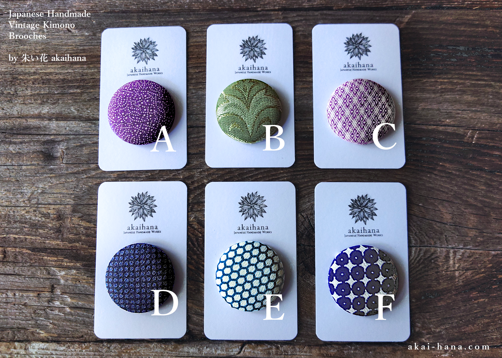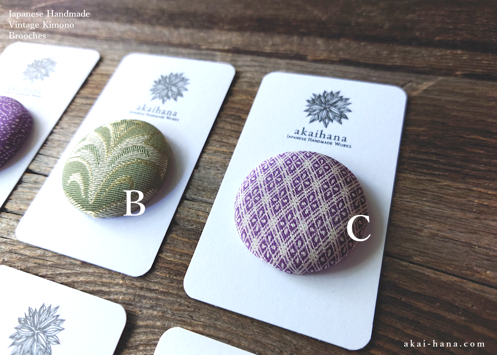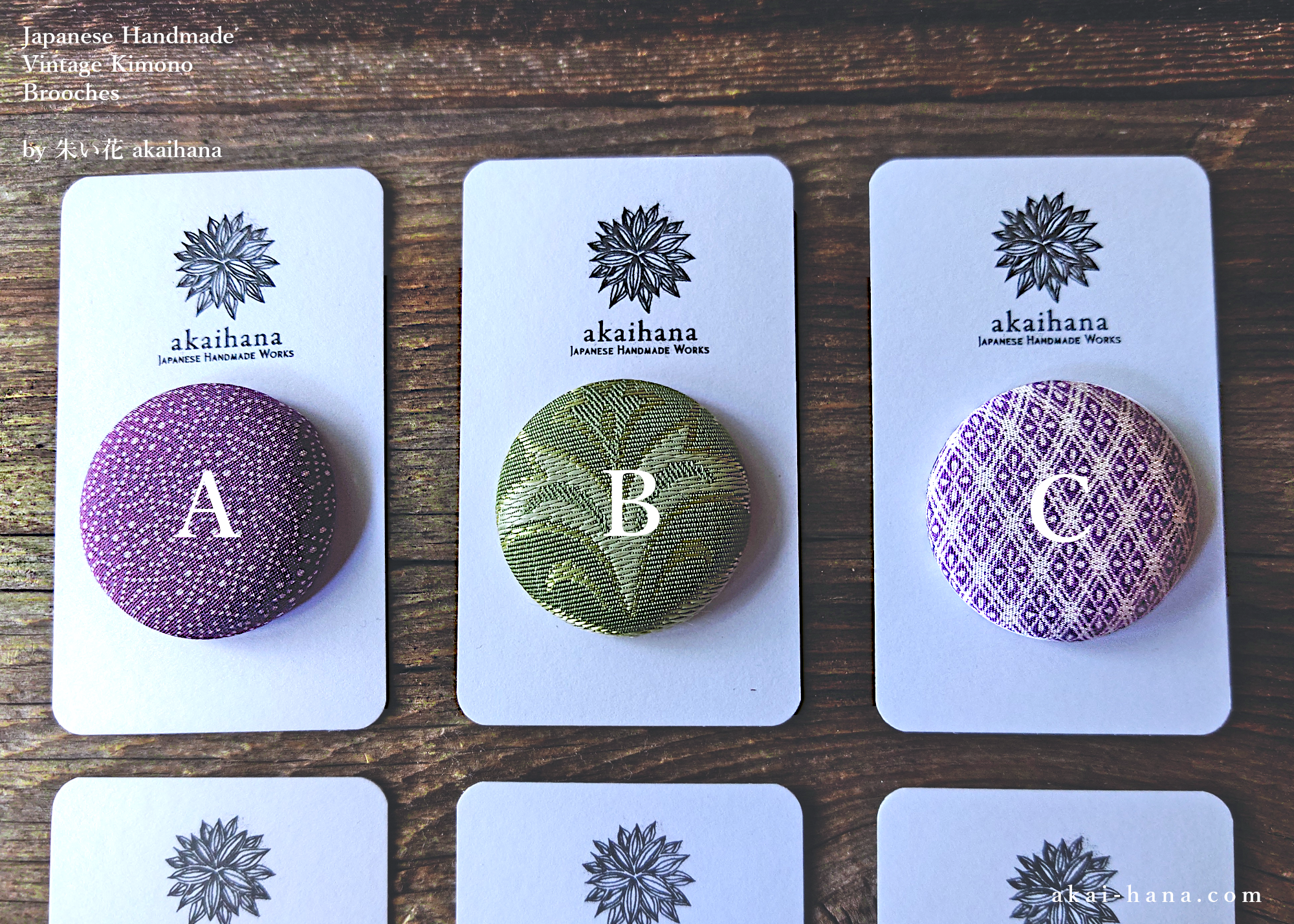 This is the pin brooches with Vintage Kimono covered button, every buttons are handcrafted by myself in the no-pets/no-smoking home studio in Kirkland WA, USA. I treat the back side of buttons with fleece/felt (the color of fleece/felt might be vary).